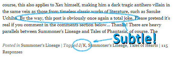 Just to clarify for those of you who might somehow still be confused: the previous two posts were jokes. No, Tales of Hearts is not dropped, and you can switch between the Localized and Romanized naming conventions to get Demon Fang or Majinken, whichever you prefer. A surprisingly large number of you were unable to figure out what was going on despite the obvious sarcasm, not-so-subtle hints, and my outright telling you that it’s a joke: